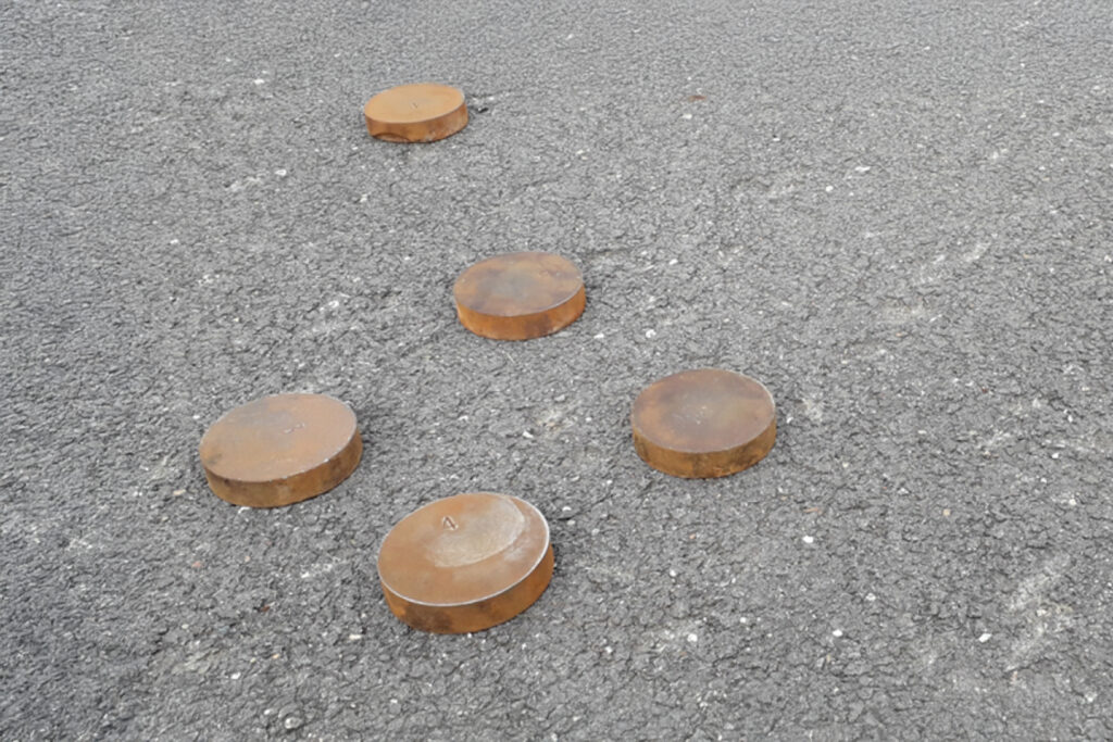 Le palet en fonte sur planche en bois (35) et le palet sur plaque en plomb...