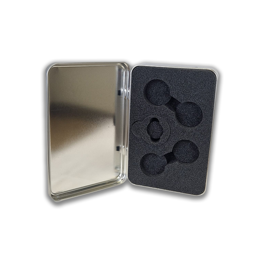Grâce à un système de modules en mousse, cette boîte peut contenir soit un jeu de palets en fonte de 54 à 57 mm de diamètre, soit un jeu de palets en laiton de 40 mm de diamètre.