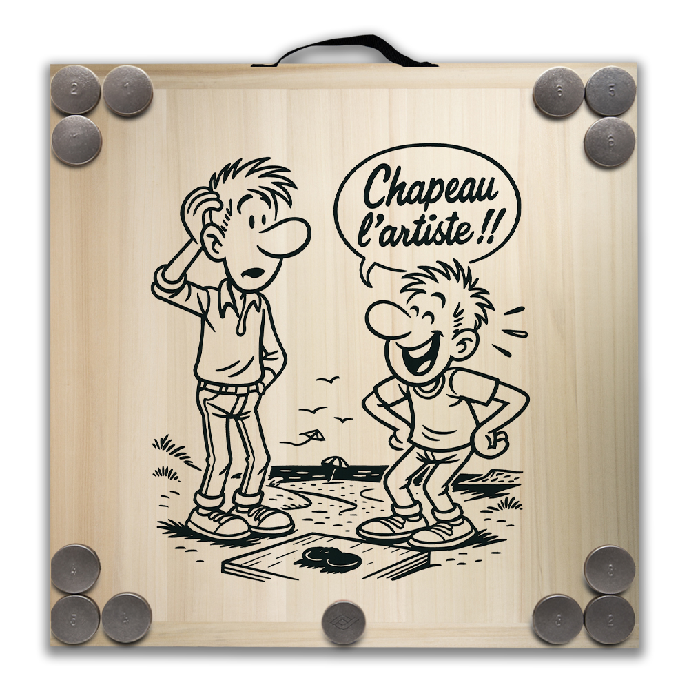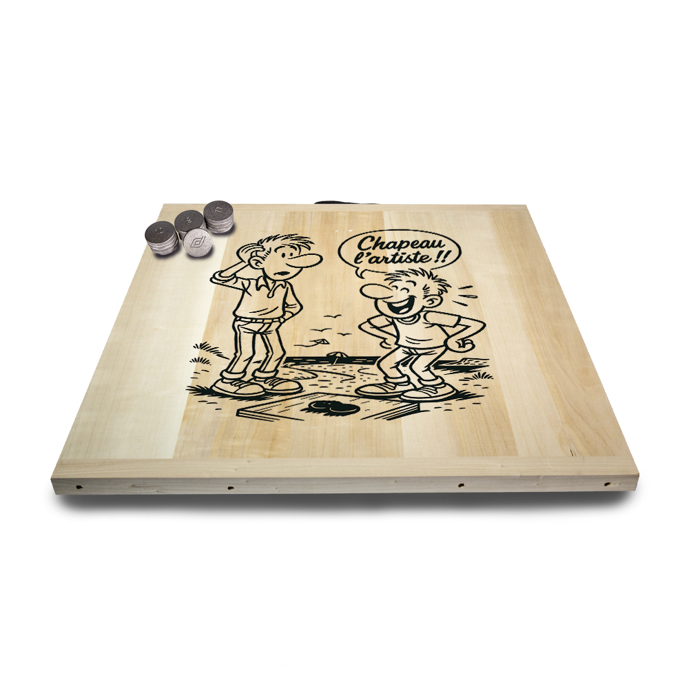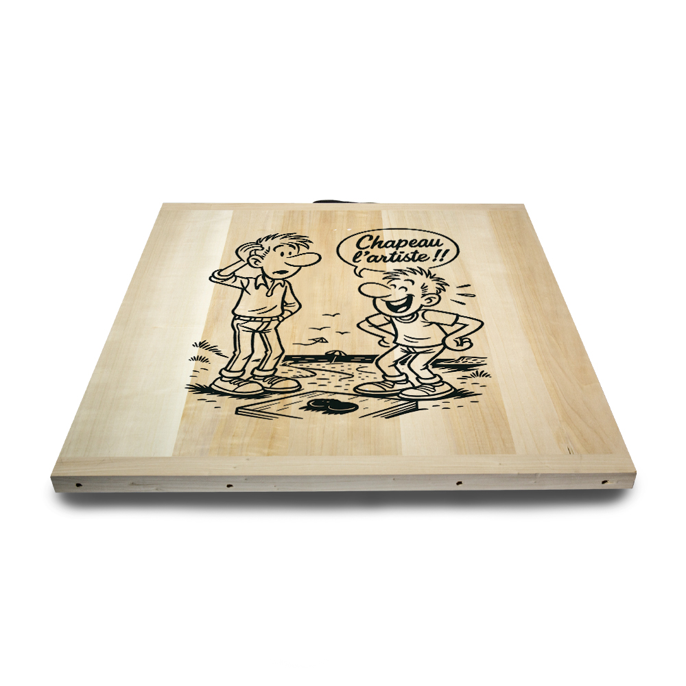Une planche, 12 palets DAVID (de notre gamme l’Amical Breton), un maître, une règle du jeu et le tour est joué ! Vous voilà équipé pour jouer seul ou en équipe au jeu de palet. Par n’importe quel temps, en intérieur ou en extérieur, sortez votre planche et partagez une activité conviviale en famille ou entre amis. Cette sérigraphie originale est apposée sur une planche en peuplier.