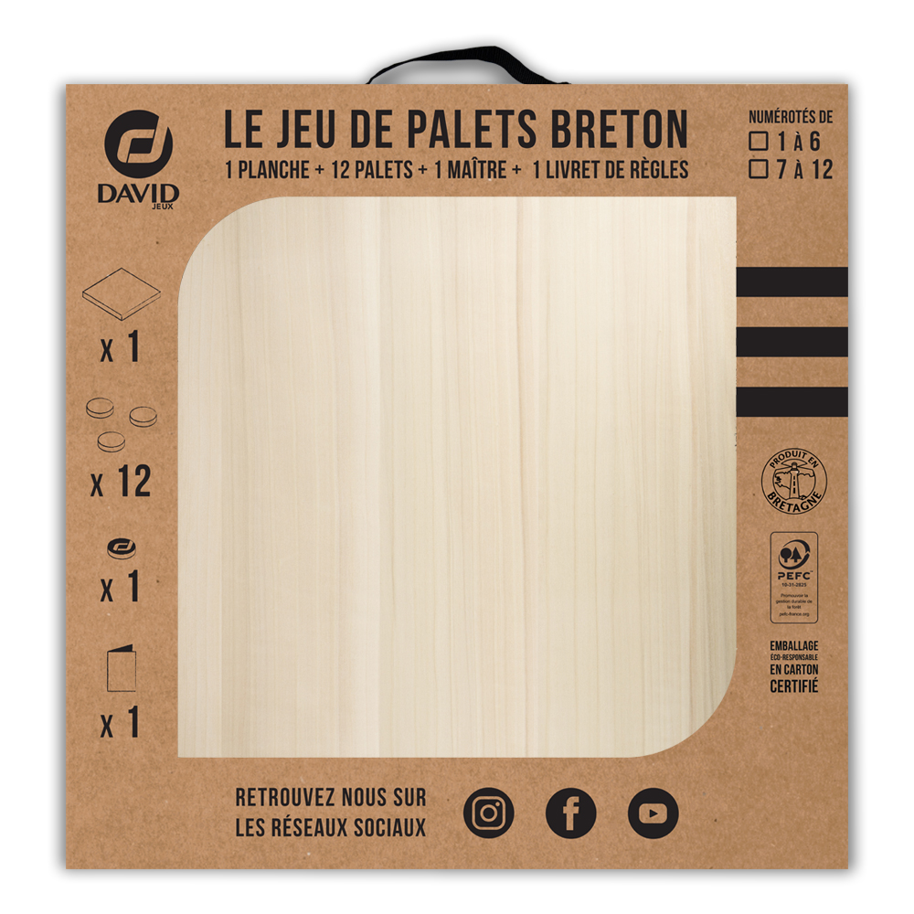Une planche, 12 palets DAVID (de notre gamme l’Amical Breton), un maître, une règle du jeu et le tour est joué ! Vous voilà équipé pour jouer seul ou en équipe au jeu de palets breton. Par n’importe quel temps, en intérieur ou en extérieur, sortez votre planche et partagez une activité conviviale en famille ou entre amis.