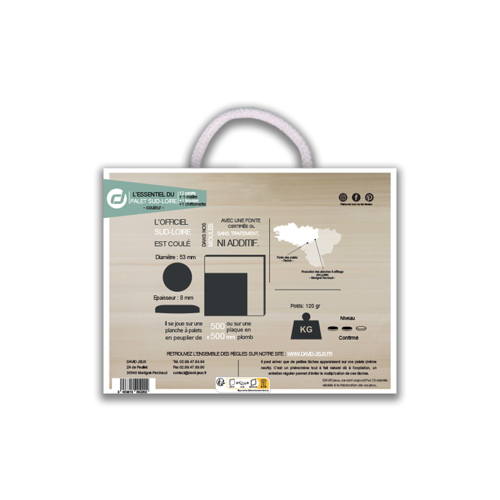 Vous y trouverez un jeu de palet en fonte « L’Officiel Sud-Loire couleur rentrant», une trousse cuir pour palets en fonte et une chamoisine.
