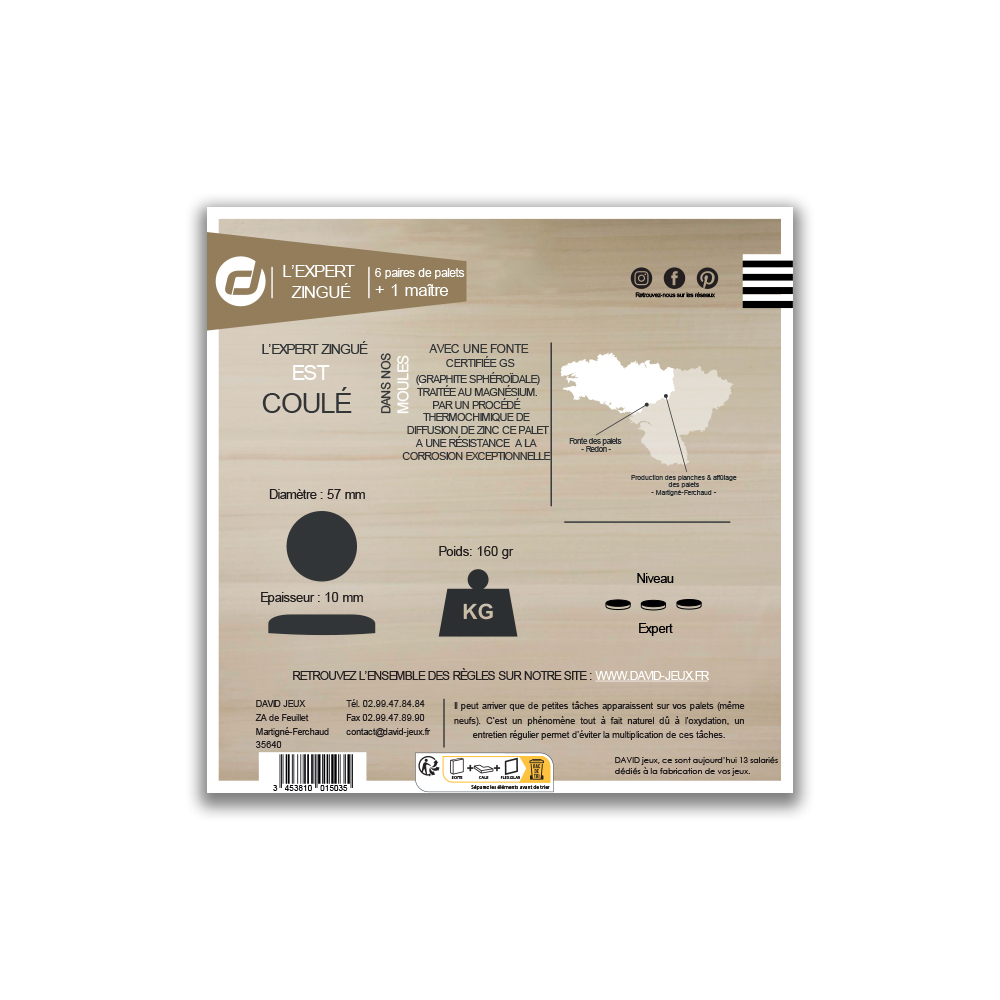 Conçu pour les joueurs passionnés, “L’Expert Zingué” est un jeu de palets breton en fonte trempée, idéal pour un usage régulier ou en compétition. Grâce à un traitement de surface au zinc, ces palets résistent efficacement à l’oxydation, prolongeant ainsi leur durée de vie même en extérieur. Leur poids équilibré et leur finition soignée offrent un excellent confort de jeu et une belle précision au lancer. Une référence robuste et fiable pour tous ceux qui souhaitent jouer sérieusement… mais toujours avec plaisir !